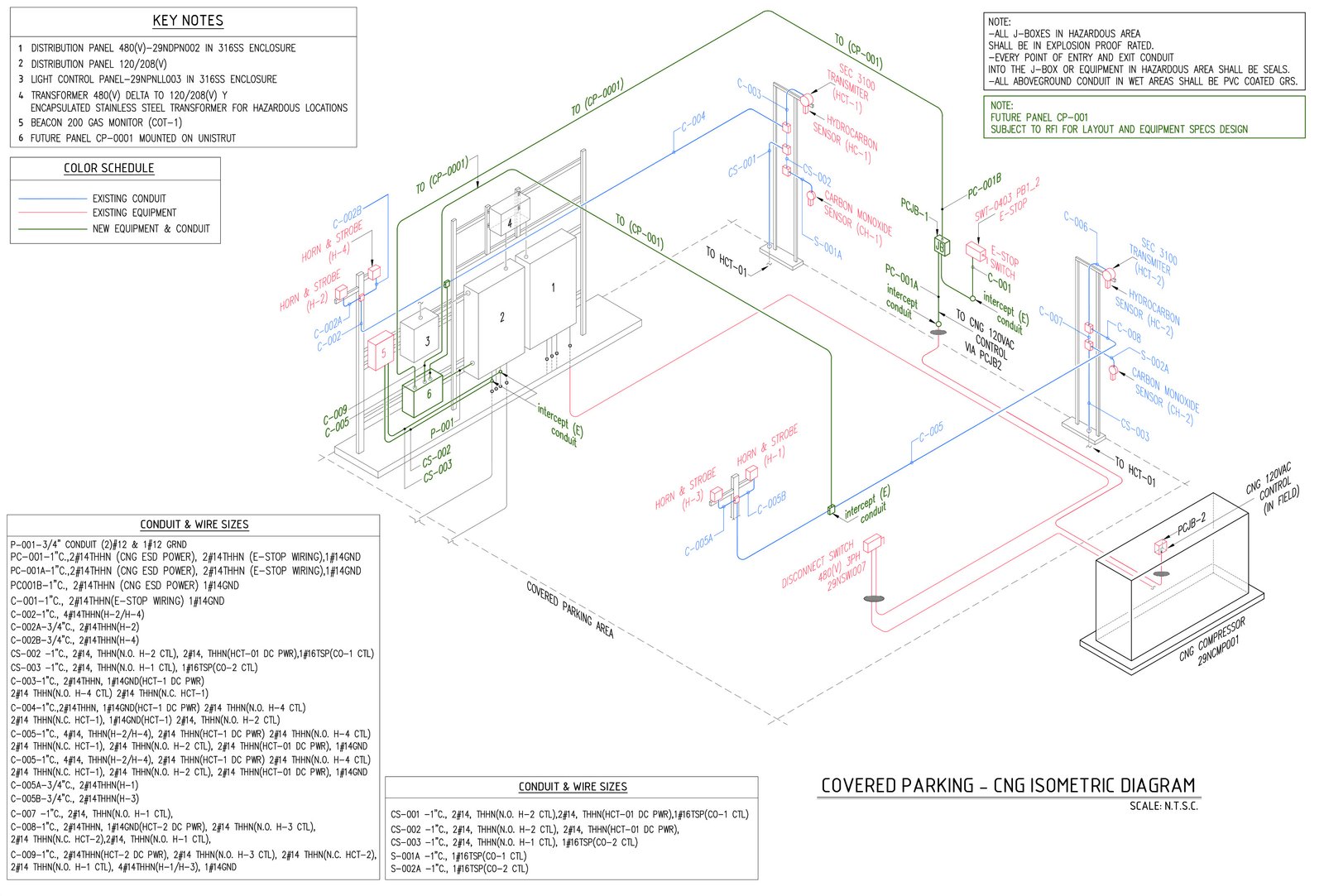 This project documents the electrical power, control, and safety systems for a Compressed Natural Gas (CNG) compressor installation within a covered parking structure. The facility required hazardous location–compliant electrical installations per NEC Article 500/501 (Class I, Division 2) due to the presence of flammable gas in the vicinity of the compressor equipment.