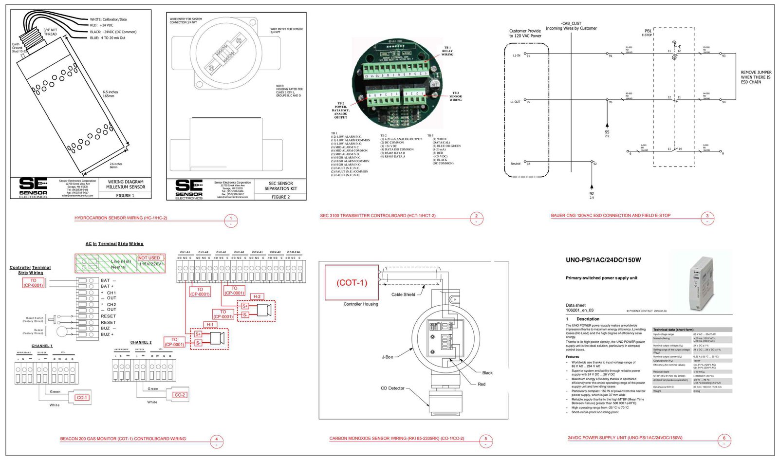 The safety system is centered on an Emergency Stop (E-Stop) network that allows any authorized personnel to shut down the compressor immediately from multiple locations. Integrated gas detection sensors — monitoring both hydrocarbon (CH₄/CNG) and carbon monoxide (CO) concentrations — trigger multi-zone horn and strobe alarm systems upon threshold breach. The compressor disconnect switch and control enclosures are rated for explosion-proof (XP) installations, and shielded control cables are used throughout the system to minimize interference with gas detection signal integrity. The documentation package includes a floor plan, riser diagram, and detailed installation sheets.